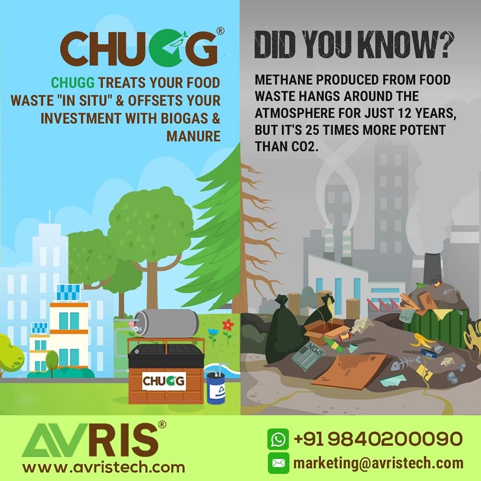 Most of the Methane is emitted from organic waste materials that rot in landfills. By recycling this food waste at a source using CHUGG- an innovative food waste treatment system curbs the emission of methane and produces Biogas- renewable energy.